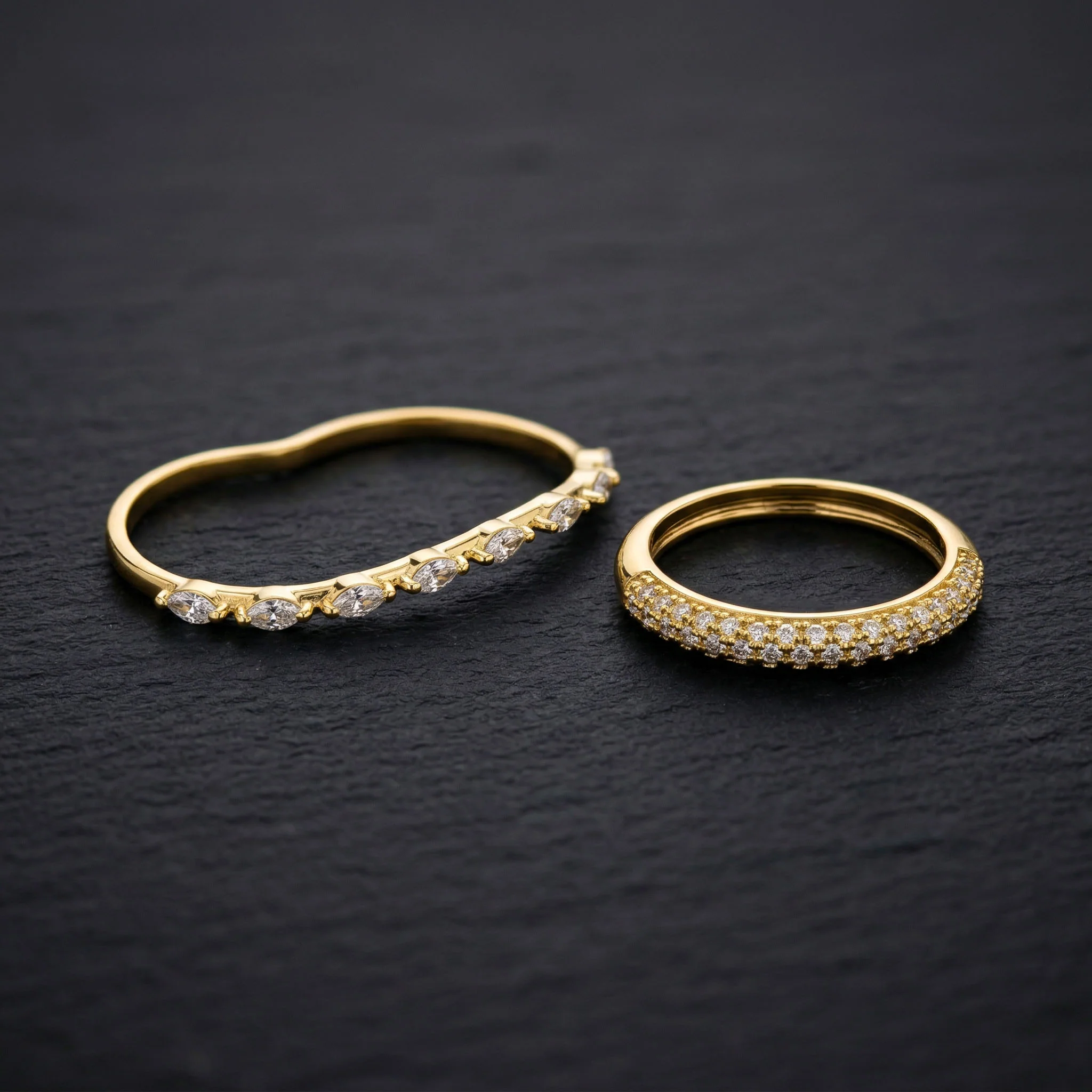 The sparkling stones on the first band catch the light beautifully, while the second band adds a contemporary, textured touch. This double band ring set is perfect for any occasion, adding refined elegance to both everyday outfits and special evening wear.
