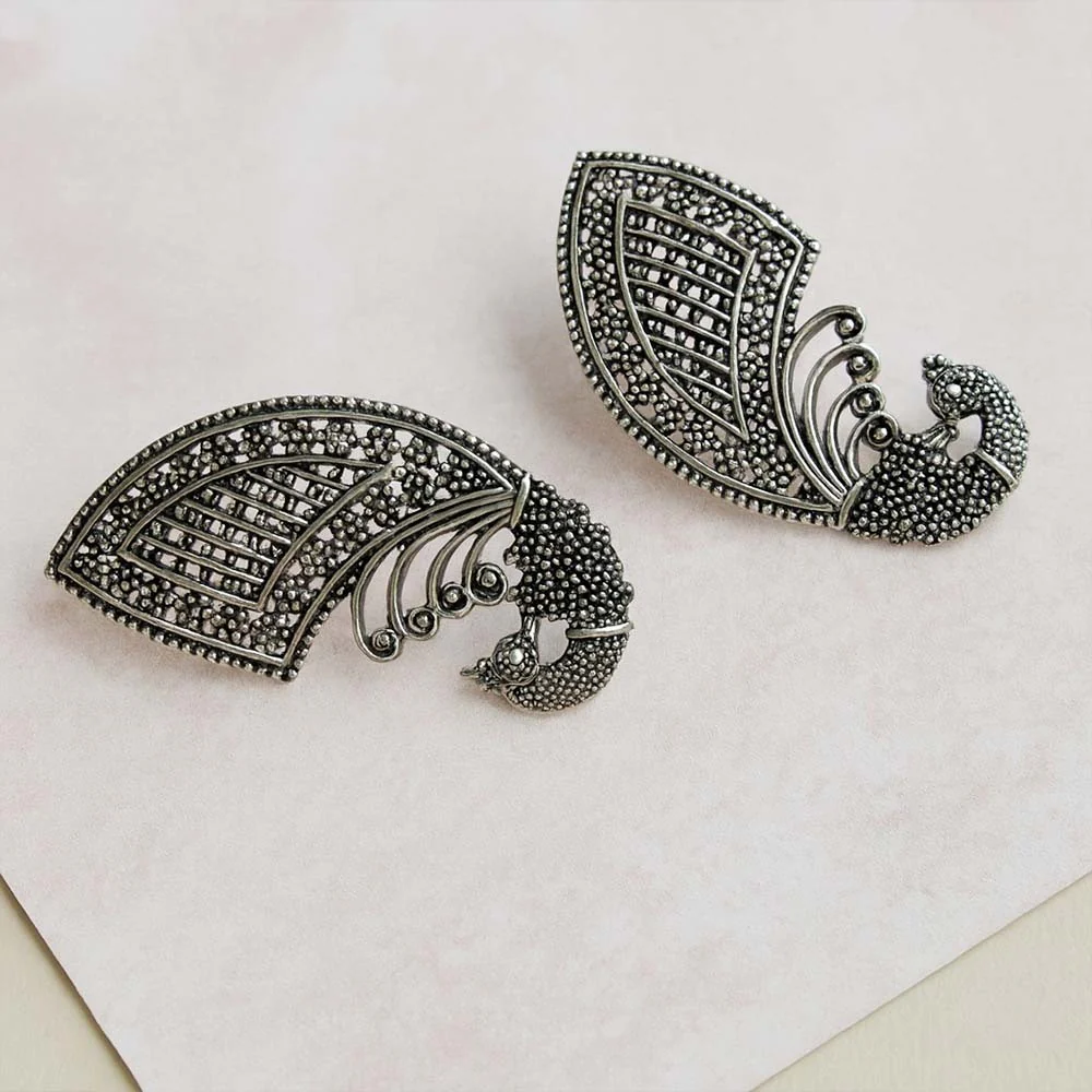 The Ishani Oxidised Earrrings for women capture the beauty of heritage Indian jewelry with a modern twist. Crafted in oxidised silver, these Oxidised Earrrings for women feature intricate peacock motifs with fan-shaped feather detailing and textured beadwork. Their antique finish gives them a timeless charm, making them the perfect choice for festivals, weddings, or everyday ethnic styling.